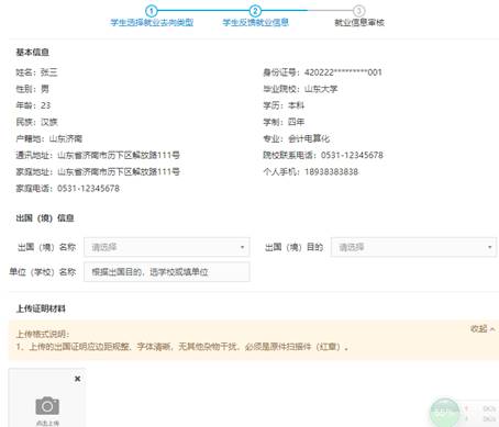 操作说明:学生如果出国,则选择选择出国类型,在界面按要求填写出国信息并上传证明材料。如有不确定信息可保存,暂不提交,确认无误信息可保存并提交审核,也可以取消本次操作返回重新选择就业去向。