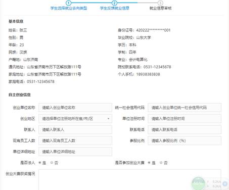 操作说明:学生如果自主创业,则选择选择自主创业类型,在界面按要求填写自主创业信息并上传证明材料。如有不确定信息可保存,暂不提交,确认无误信息可保存并提交审核,也可以取消本次操作返回重新选择就业去向。