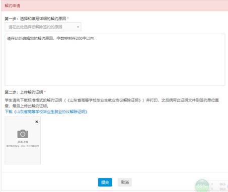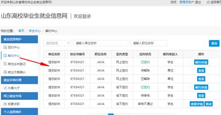 2、录入协议解除:协议书生效后,由学生填写解约原因,上传解约证明后提出解约申请,等待学校审核结果,审核通过协议解除,审核未过协议仍有效。