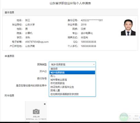 功能描述:实现山东省内院校困难家庭高校毕业生求职创业补贴申请填表功能。