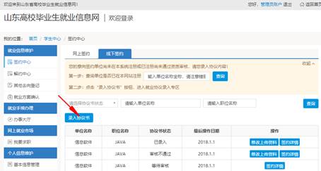 1、录入签约信息:学生按要求录入签约单位基本信息和档案接收信息。如有不确定信息可保存,暂不提交,确认无误信息可保存并生成协议书。提交系统即生成有效协议书,如解除协议,则由学生提出需经过学校同意方可解除。
