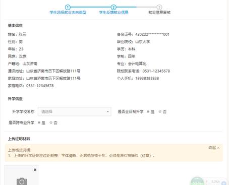 操作说明:学生如果升学,则选择选择升学类型,在界面按要求填写升学信息并上传证明材料。如有不确定信息可保存,暂不提交,确认无误信息可保存并提交审核,也可以取消本次操作返回重新选择就业去向。