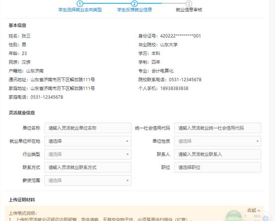 操作说明:学生如果与单位灵活就业方式就业,则选择选择灵活就业类型,在界面按要求填写灵活就业信息并上传证明材料。如有不确定信息可保存,暂不提交,确认无误信息可保存并提交审核,也可以取消本次操作返回重新选择就业去向。