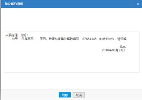 (2)单位提出解约申请:学生收到单位解约通知,同意回复即完成解约,取消则协议继续有效。