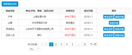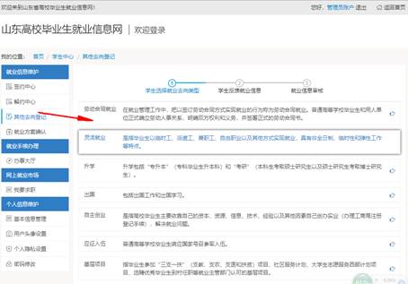 功能描述:实现省内院校毕业生签订就业协议之外的毕业去向信息登记功能。包括劳动合同就业、灵活就业、升学、出国、自主创业、应征入伍和基层项目就业七种去向。
