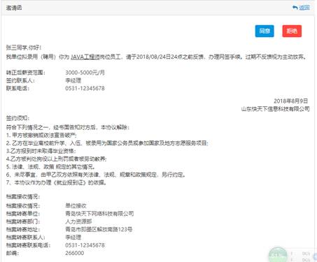1、查看邀请函。毕业生收到单位发送的签约邀请后,查看邀请内容,进行回复。回复同意即生成协议书,回复拒绝则邀请函无效。