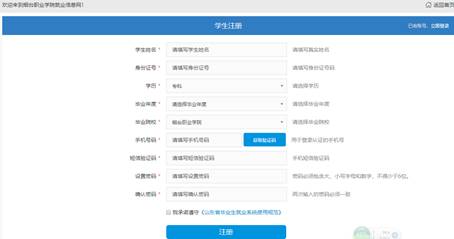 功能描述:学生通过山东高校毕业生就业信息网登录/注册入口,进入注册界面,完成信息填写,提交注册信息验证,验证通过注册成功。