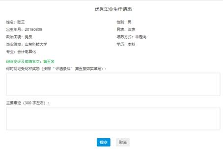 功能描述:实现山东省内院校毕业生《优秀毕业生评审表》内容填写功能。