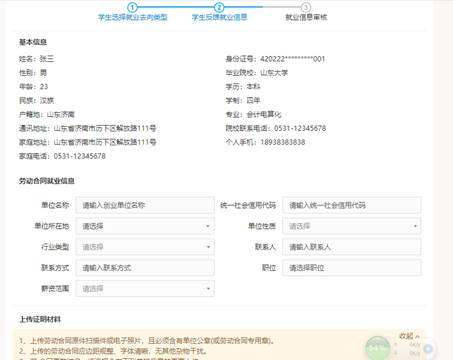 操作说明:学生如果与单位签订合同方式就业,则选择选择劳动合同就业类型,在界面按要求填写劳动合同就业信息并上传证明材料。如有不确定信息可保存,暂不提交,确认无误信息可保存并提交审核,也可以取消本次操作返回重新选择就业去向。