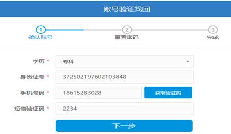 第一步:确认账号。通过学历、身份证号和手机号验证账户,验证通过进入下一步。