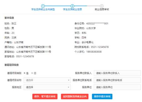 操作说明:学生如果参加国家或地方基层项目,则选择选择基层项目类型,在界面按要求填写基层项目信息。如有不确定信息可保存,暂不提交,确认无误信息可保存并提交审核,也可以取消本次操作返回重新选择就业去向。