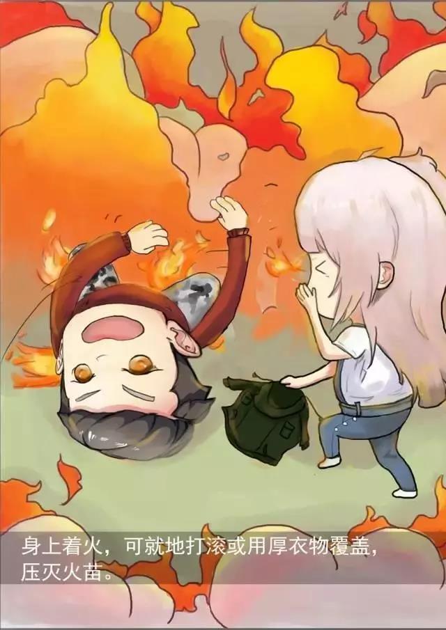 火已烧身,切勿惊跑,就地打滚,压灭火苗;