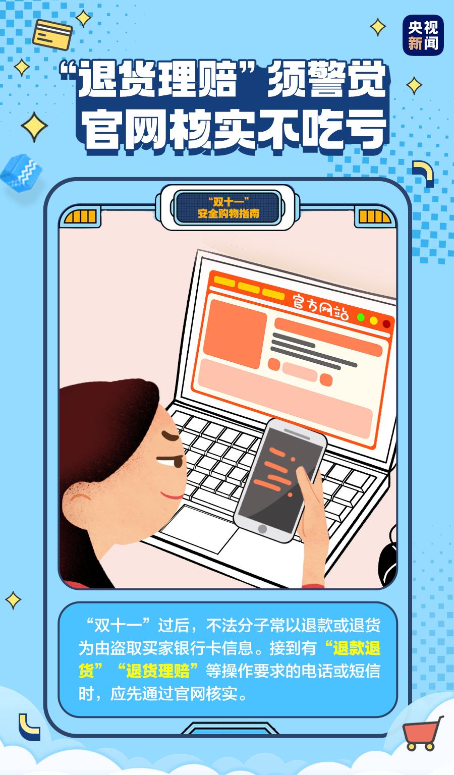 很多人希望趁着购物节,买到物美价廉的好东西。但也有一些不法商家或电信诈骗组织,企图利用消费者的贪便宜心理以及对规则的不了解,从中骗取钱财。今天,团小航为你准备了一份“双十一”安全购物指南,快来了解学习,谨防上当吃亏