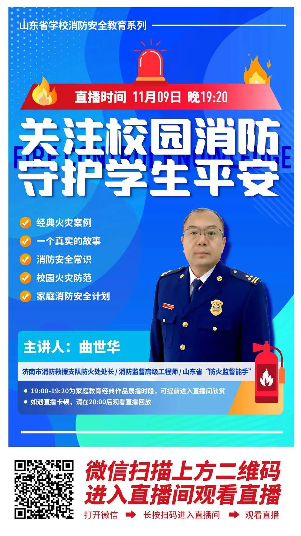 今天是第29个全国消防宣传日,山东省学校消防安全直播将于11月9日(今天)晚上19:20播出,济南市消防救援支队防火处处长、消防监督高级工程师、山东省“防火监督能手”曲世华处长直播讲解:关注校园消防、守护学生平安;直播开始前20分钟有家庭教育经典作品展播,请通过微信扫描下方海报中的二维码进入直播间观看直播