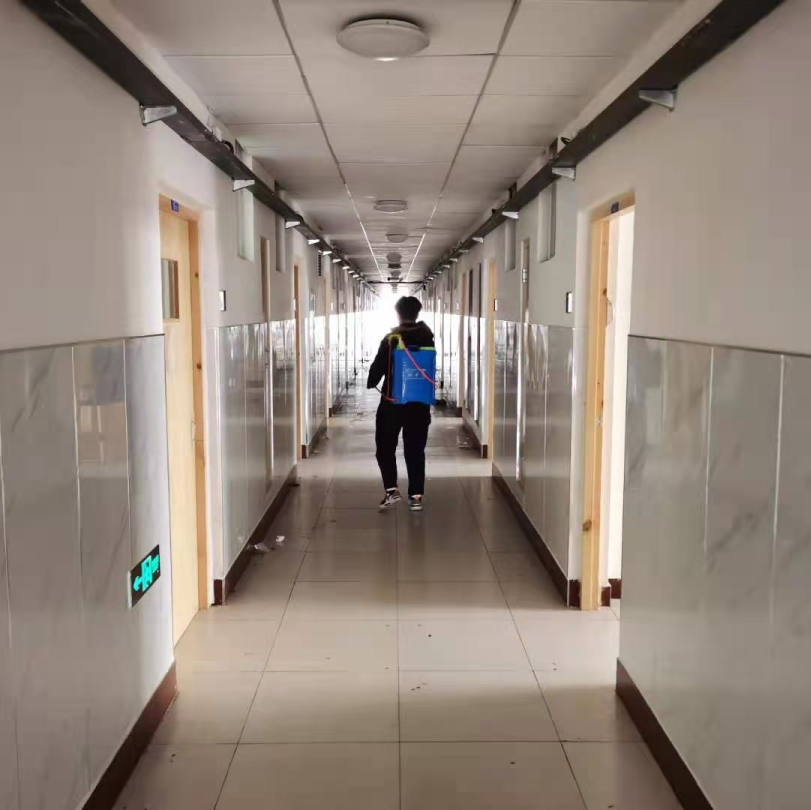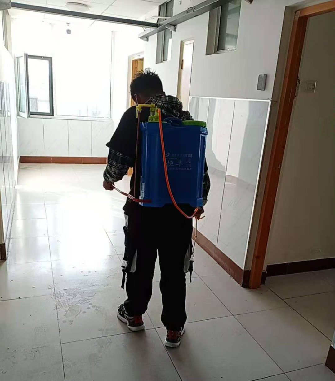 我校楼管会组织消杀小队为宿舍楼进行消毒杀菌工作.