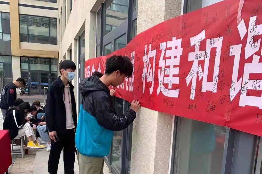 小小横幅拉起安全誓语,在尊重各同学的意见后同学们自发进行在条幅上签名。与团小航一起签下名字,共同守护安全寝室生活。