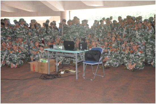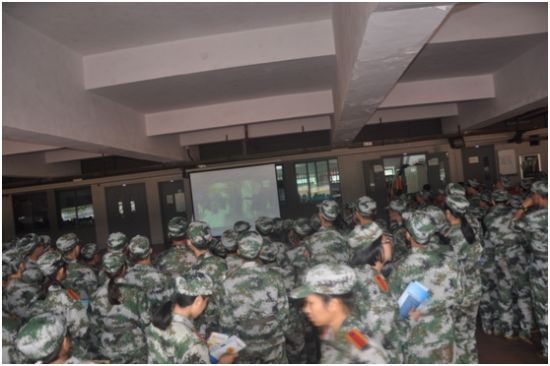 日照航海工程职业学院学生处反邪教宣传活动方在新生军训期间,利用军训休息间隙,在军训田径场架设投影仪播放防范邪教宣传短片,分方队分批次对新生进行反邪教警示教育宣传。