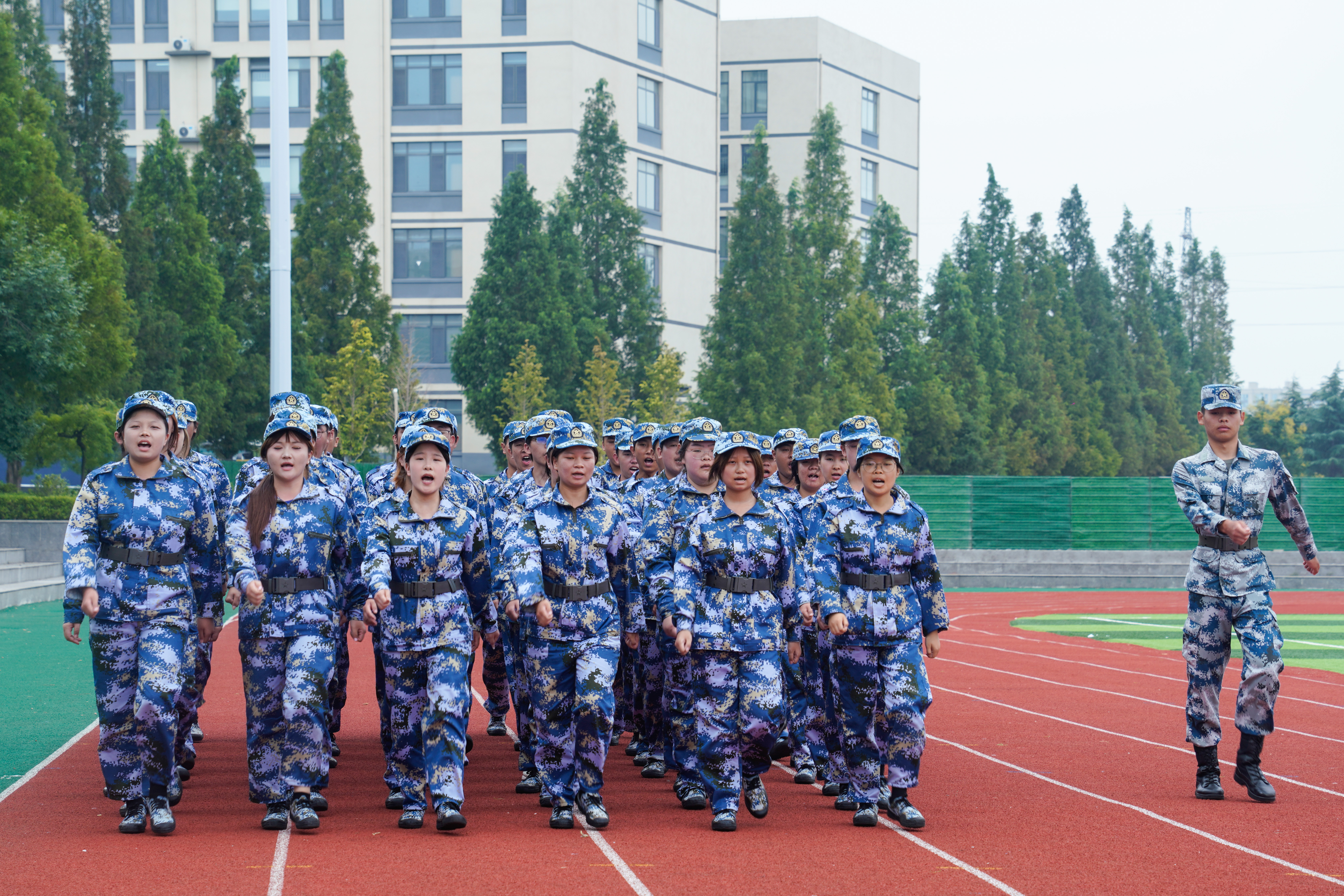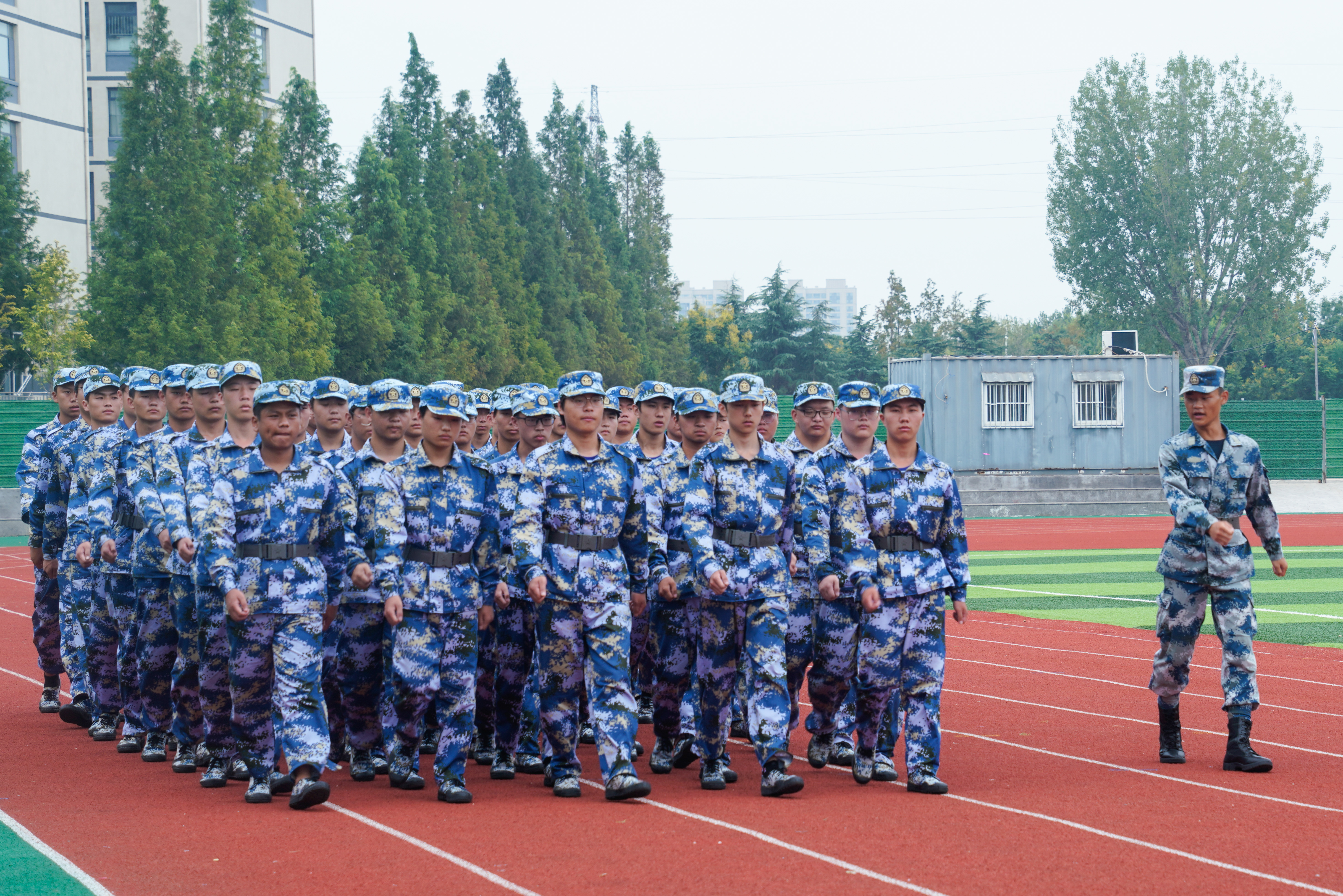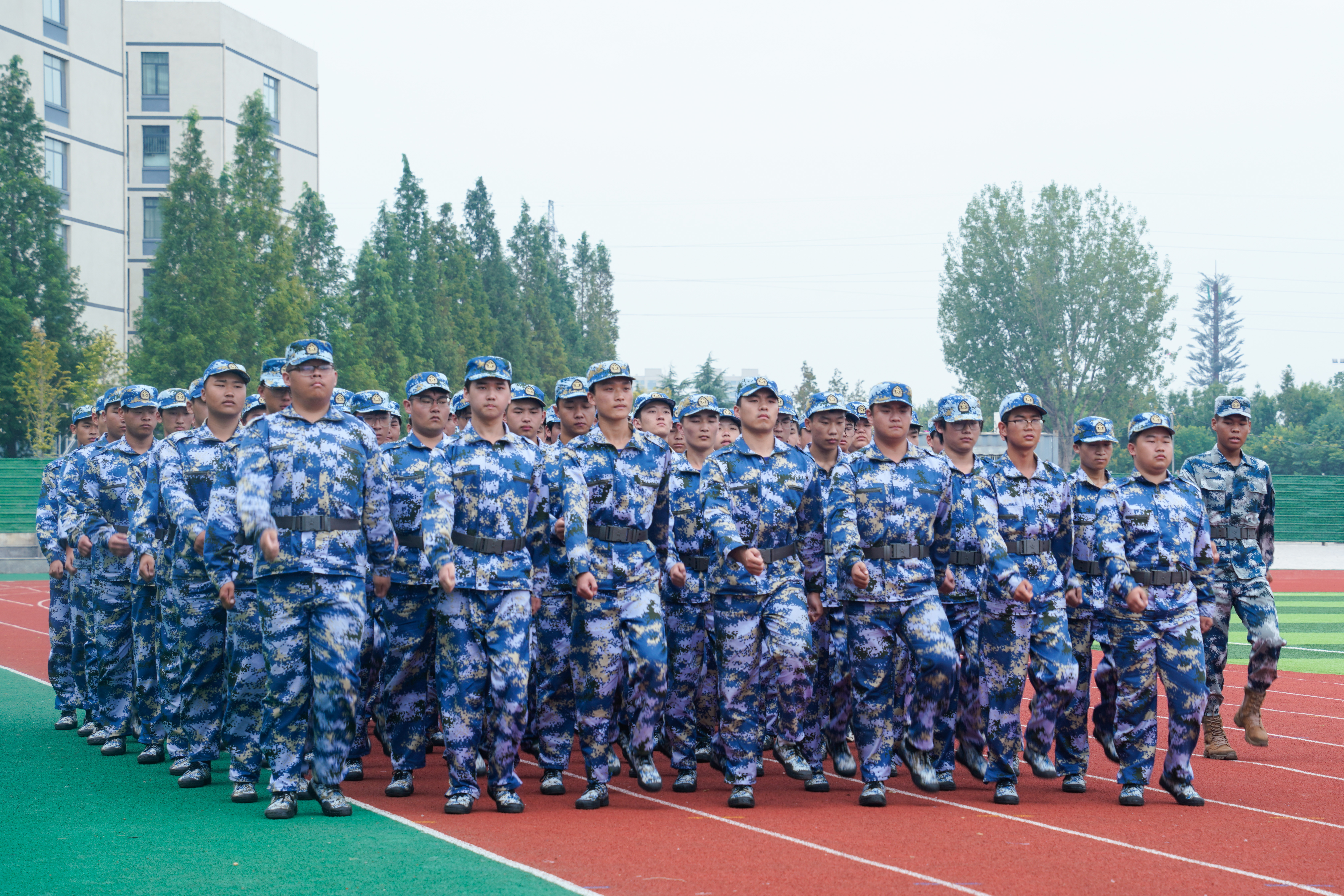 仪式在庄严的国歌声中拉开序幕,全体师生肃立齐唱,激昂的旋律回荡在整个会场,为这段特殊的军训经历增添了庄严而隆重的精神底色。开启军训汇报表演。三支连队依次登场,转体利落、步幅统一,迷彩身影在阳光下划出整齐弧线,蹲起的动作连贯有序,起身时腰背挺直,下蹲时节奏一致,尽显数日训练的扎实功底,将转向与蹲起动作衔接自如,指令下达瞬间,全连动作同步,无一偏差。
