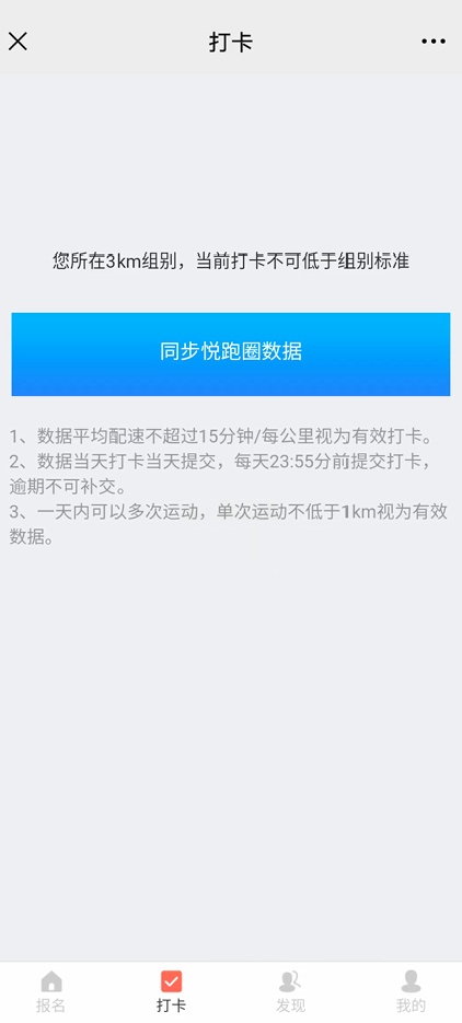 (2)一天内多次运动。每次运动的公里数不得低于 1km, 每次运动前均需要先登录“悦跑圈”APP,点击“开始”按 钮计数,运动完成 1KM 及以上后,在“悦跑圈”APP 点击“结 束”按钮。再登录微信公众号“走伴健走”比赛系统点击打 卡按钮完成打卡。一天内可多次打卡,以最后一次打卡提交 的当天总数据为准。
