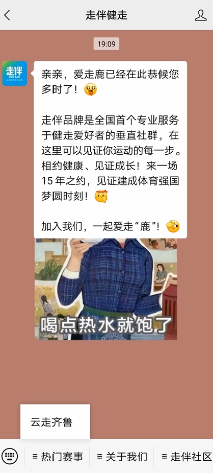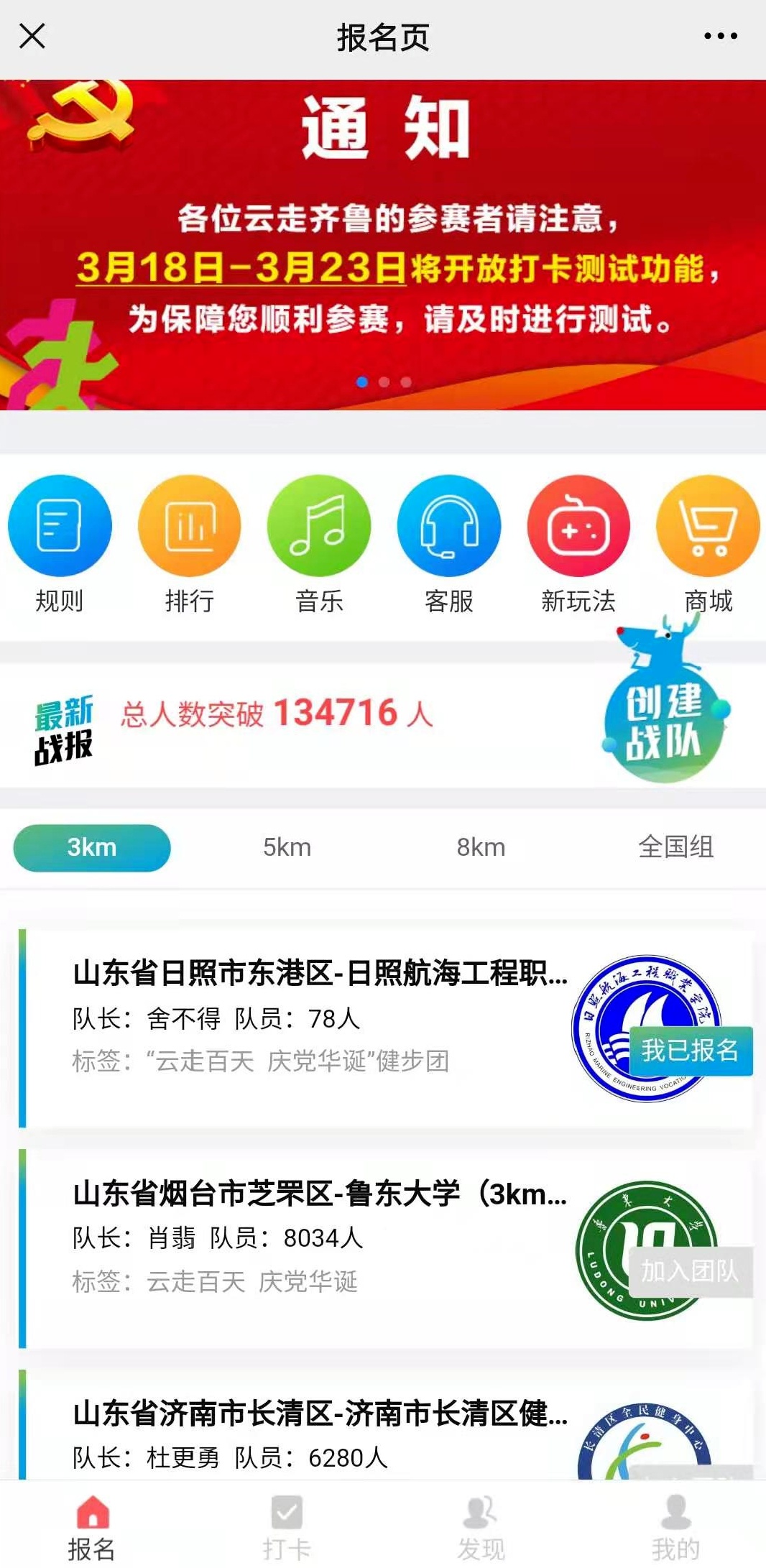 1.请在微信中关注“走伴健走”公众号,在公众号子菜 单中选择“云走齐鲁”进行报名。