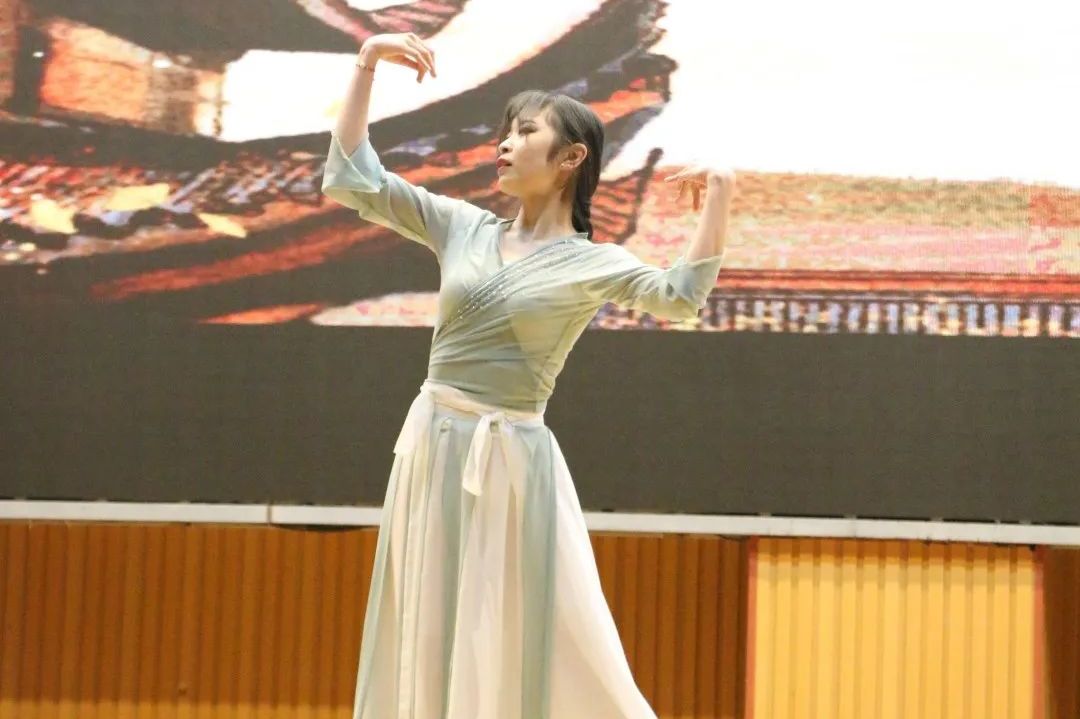 裙似飞鸾,袖如回雪,裙袖舞动,一阵颤栗从她左手指尖传至肩膀,又从肩膀传至右手指尖。手上的银钏也随之振动,每一个动作都自然流畅。每一个旋转,踢腿,抬手都把舞蹈的优美,婀娜多姿做的淋漓尽致。