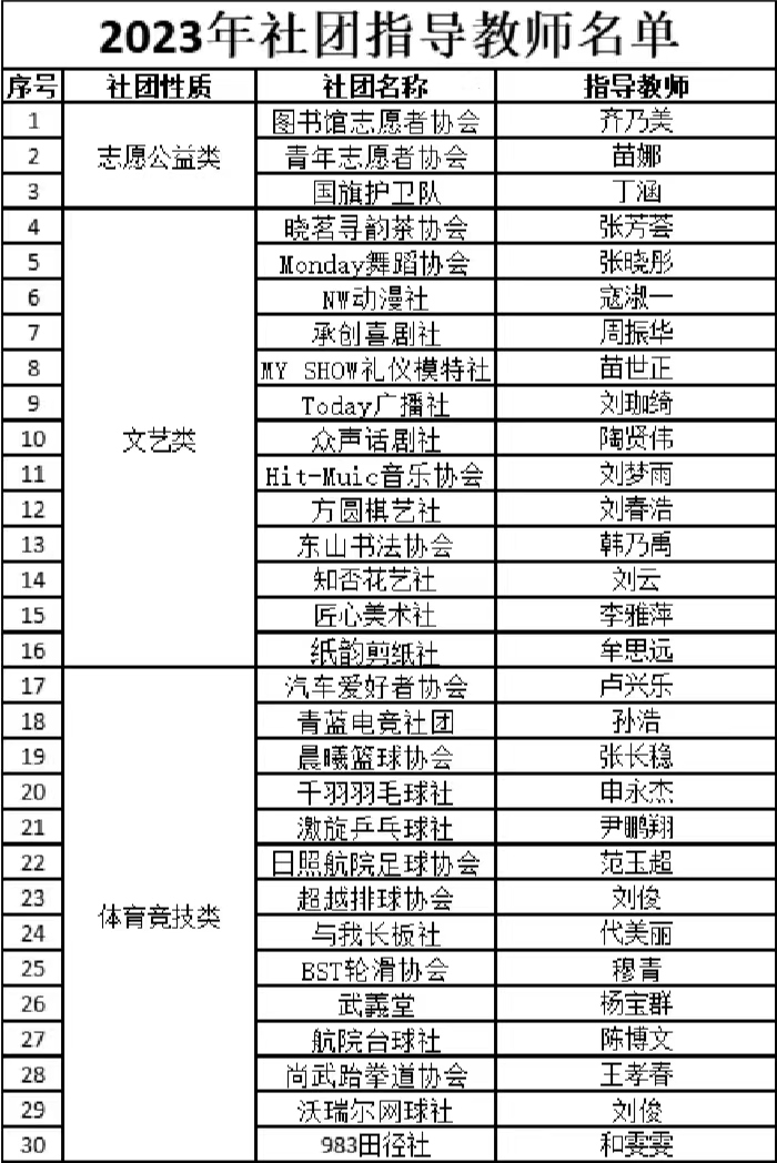 根据《日照航海工程职业学院学生社团指导教师管理办法》和《关于选聘2023年学生社团指导教师的通知》,经校团委审核,现拟聘以下30位老师担任2023年学生社团指导教师,现将结果公示如下,如有异议联系校团委。