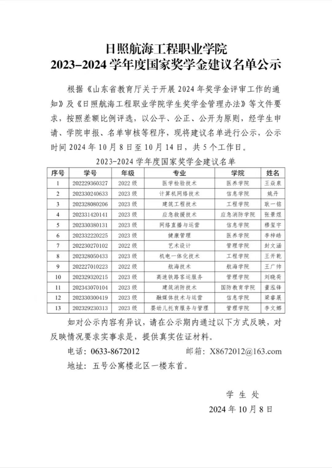日照航海工程职业学院2023-2024学年度国家奖学金建议名单公示