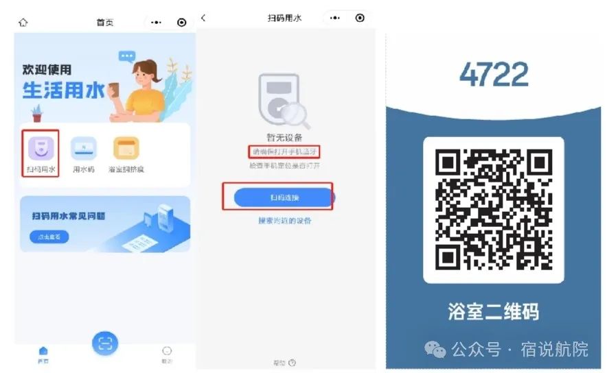 点击扫码用水,在点击扫码连接,扫一下房间内的淋浴二维码。(扫用水二维码之前,请先打开手机蓝牙)