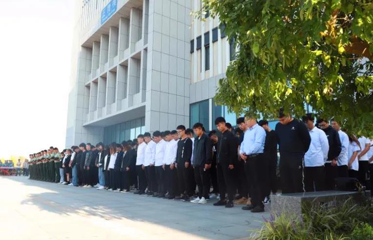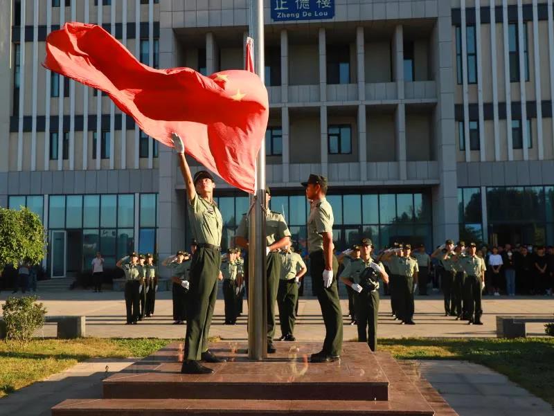 上午7时整,国旗护卫队准时向正德楼广场行进,他们迎着朝阳,昂首挺胸,踏着整齐铿锵的步伐将五星红旗护送至升旗台。“升国旗,奏唱国歌!”随着一声令下,雄壮的《义勇军进行曲》奏响,五星红旗冉冉升起,一声敬礼,全场肃穆。现场观礼的师生在庄严肃穆的气氛中共同回忆历史,缅怀先烈,向在抗日战争中死难的同胞默哀。