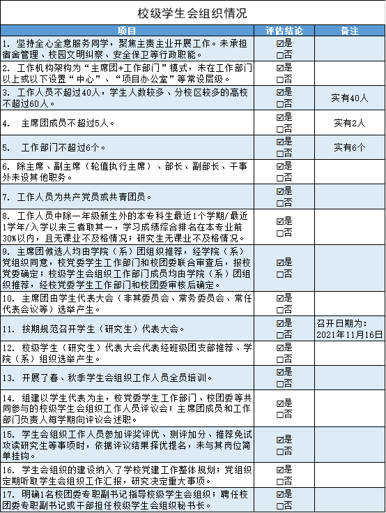 为落实共青团中央、教育部、全国学联联合下发的《关于推动高校学生会(研究生会)深化改革的若干意见》,接受广大师生监督,现将我校截至2021年11月学生会(研究生会)改革情况公开如下。