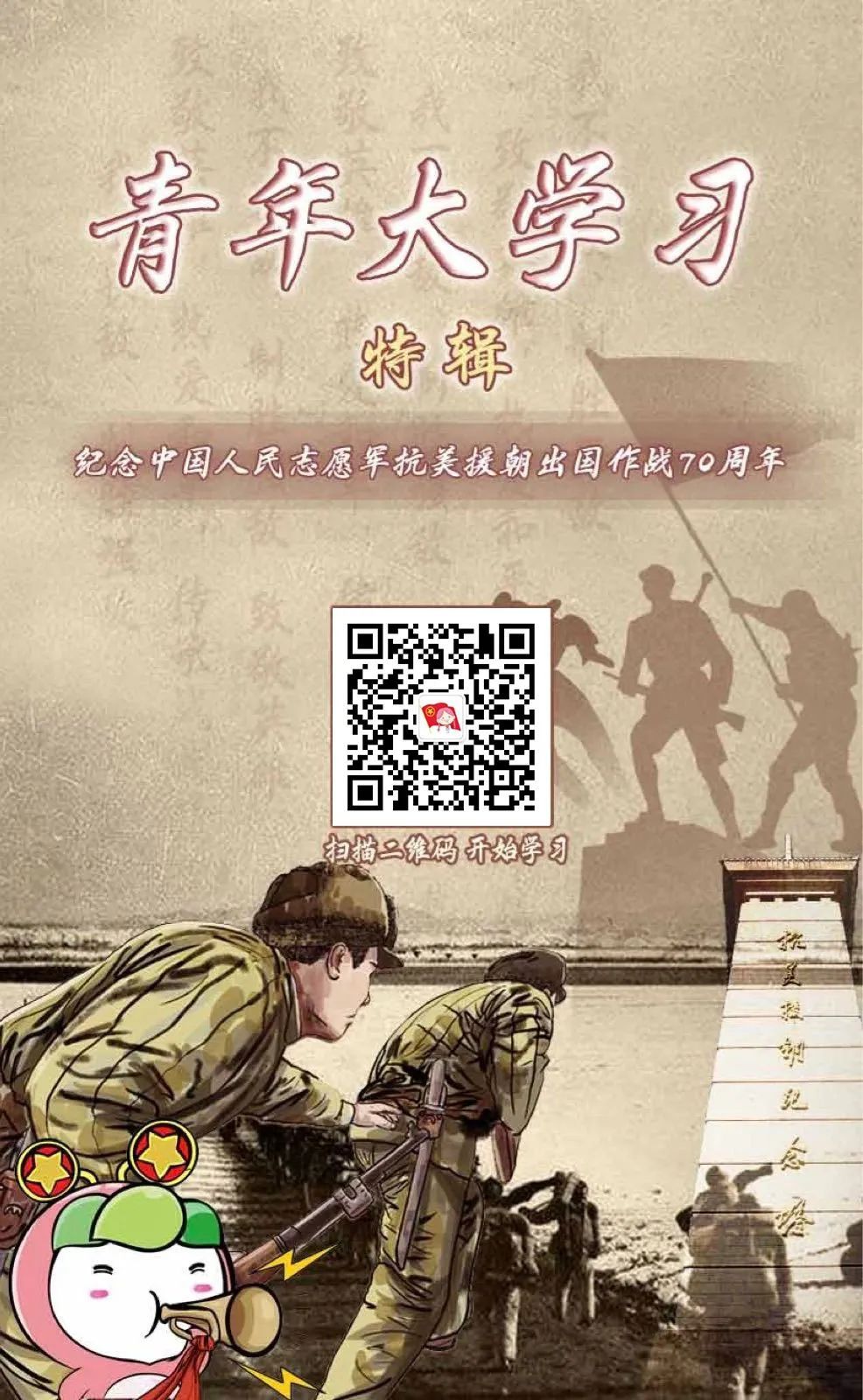 “我们要铭记抗美援朝战争的艰辛历程和伟大胜利,敢于斗争、善于斗争,知难而进、坚韧向前,把新时代中国特色社会主义伟大事业不断推向前进。”在10月23日召开的纪念中国人民志愿军抗美援朝出国作战70周年大会上,习近平总书记发表重要讲话,全面回顾总结抗美援朝战争的伟大胜利和巨大贡献,深刻阐述了抗美援朝精神的历史意义和时代价值,精辟揭示了抗美援朝战争的历史启示,郑重宣示捍卫国家领土主权和统一、维护地区和世界和平稳定、推动构建人类命运共同体的坚定立场和决心,凝聚起团结奋进新征程的磅礴力量。 为纪念中国人民志愿军抗美援朝出国作战70周年,“青年大学习”推出特辑,来到位于辽宁丹东的抗美援朝纪念馆,邀请央视记者王冰冰和我们一起追忆峥嵘岁月,学习英雄事迹,缅怀革命先烈,传承伟大抗美援朝精神。
