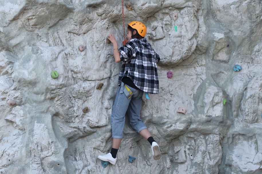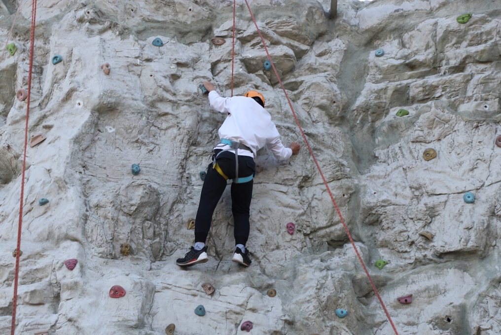 志坚者,功名之柱也,登山不以艰险而止,则必臻乎峻岭。头戴盔,身绑绳,成员们攀上近乎垂直状的岩石,他们克服了内心的恐惧,勇敢的爬上在高端。每当想退缩时,地面上其他成员鼓励的呐喊声,教练手中拉紧的绳子,都给予了希望。让每一个参与的人都有“会当凌绝顶,一览众山小。”体验。